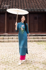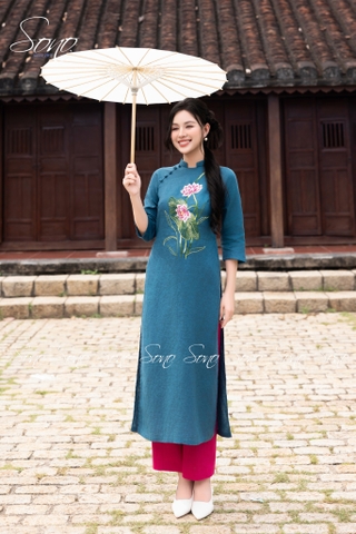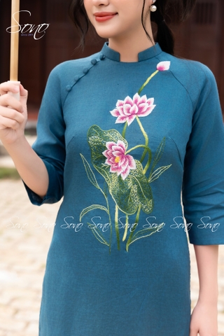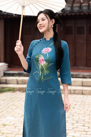 Hoa sen tinh khôi nở rộ trên nền xanh cổ vịt thanh lịch, tôn lên vẻ đẹp truyền thống mà vẫn hiện đại. Chất liệu linen cao cấp mềm mại, đường kim mũi chỉ tinh xảo, chắc chắn sẽ khiến nàng trở thành tâm điểm của mọi ánh nhìn.