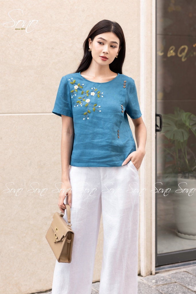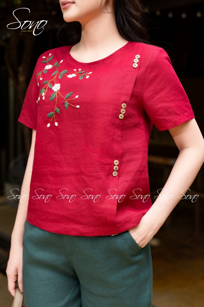 Chất vải mát và thoáng, càng mặc càng mềm, kết hợp cùng chi tiết thêu tay tinh xảo và hàng khuy lệch vai duyên dáng.