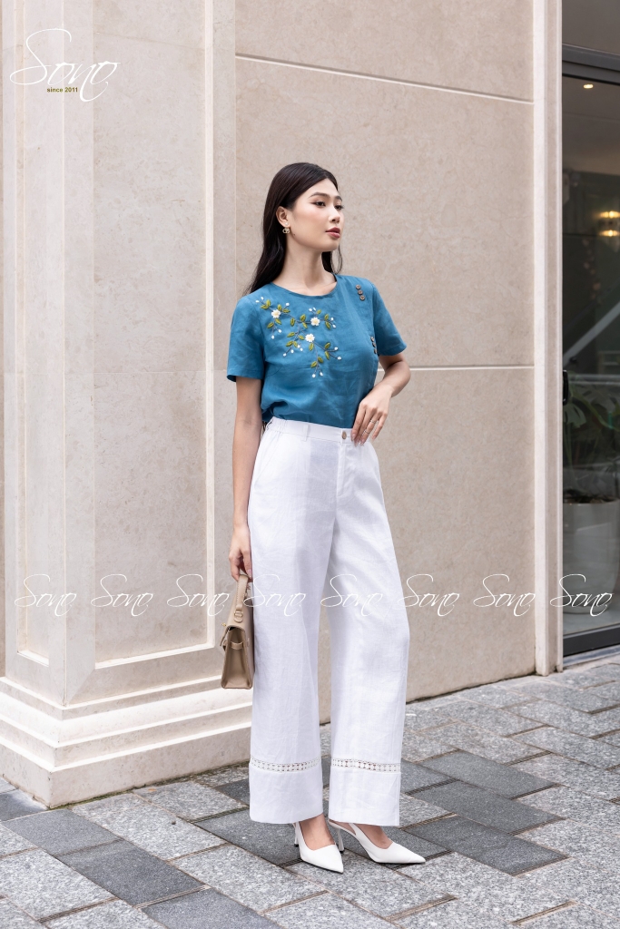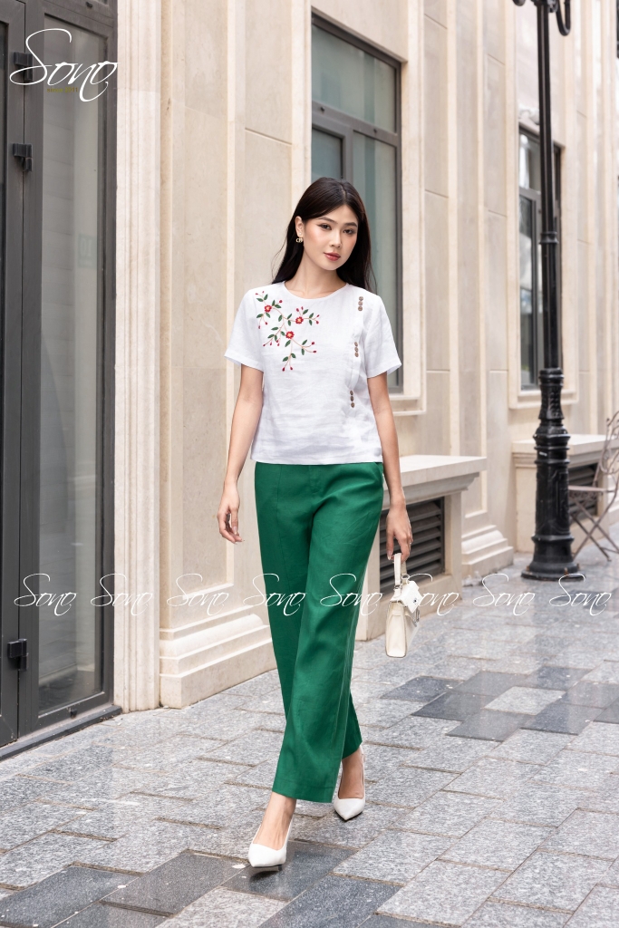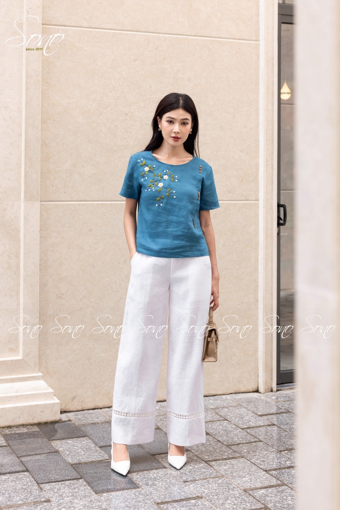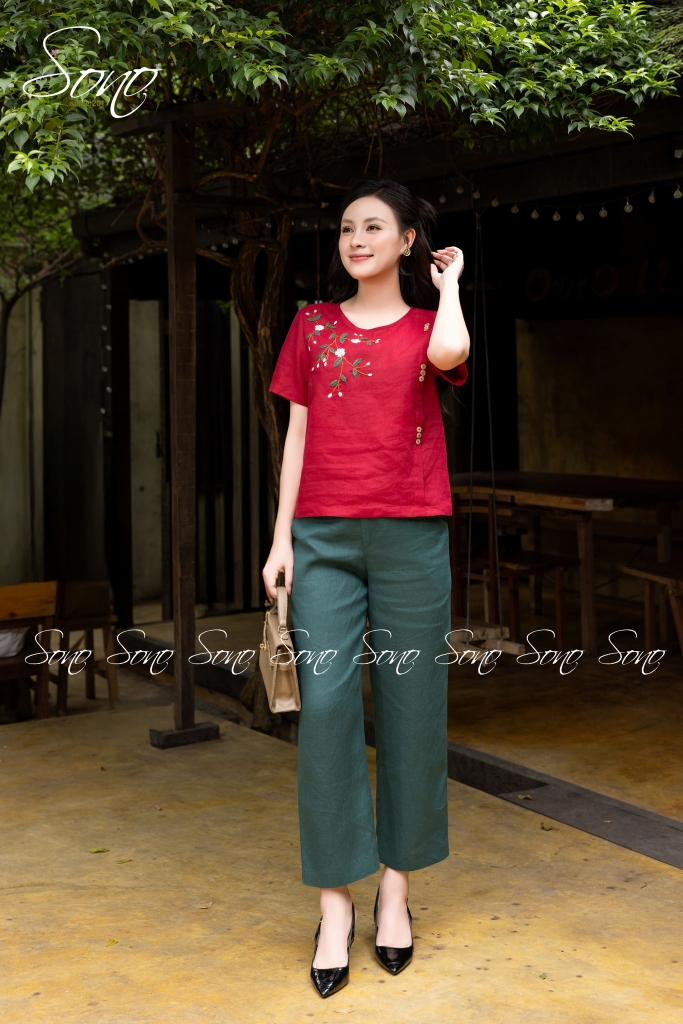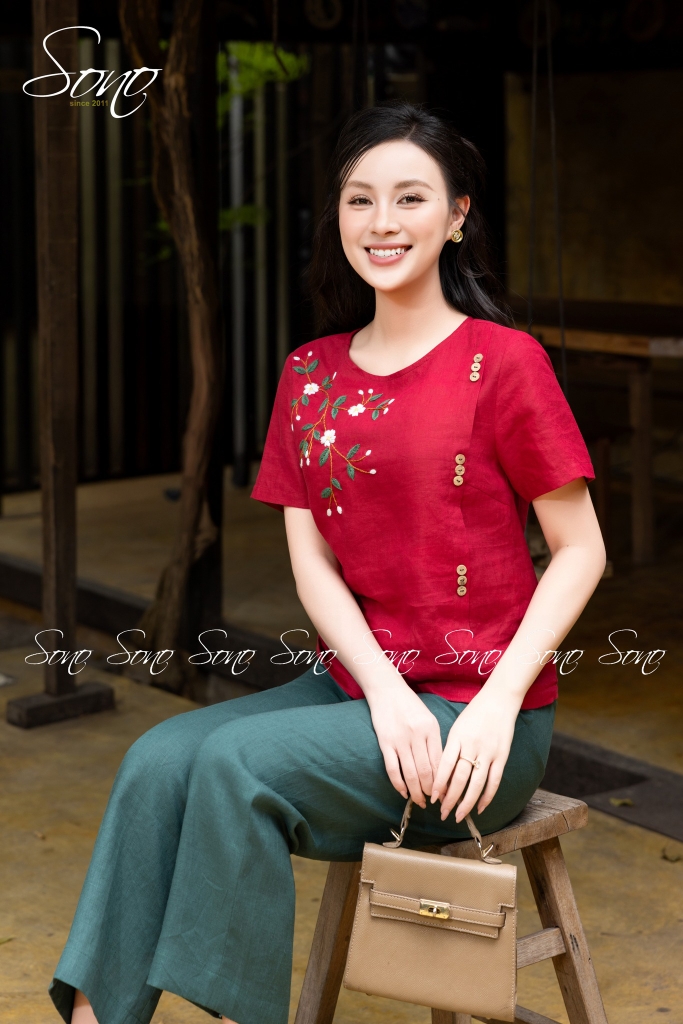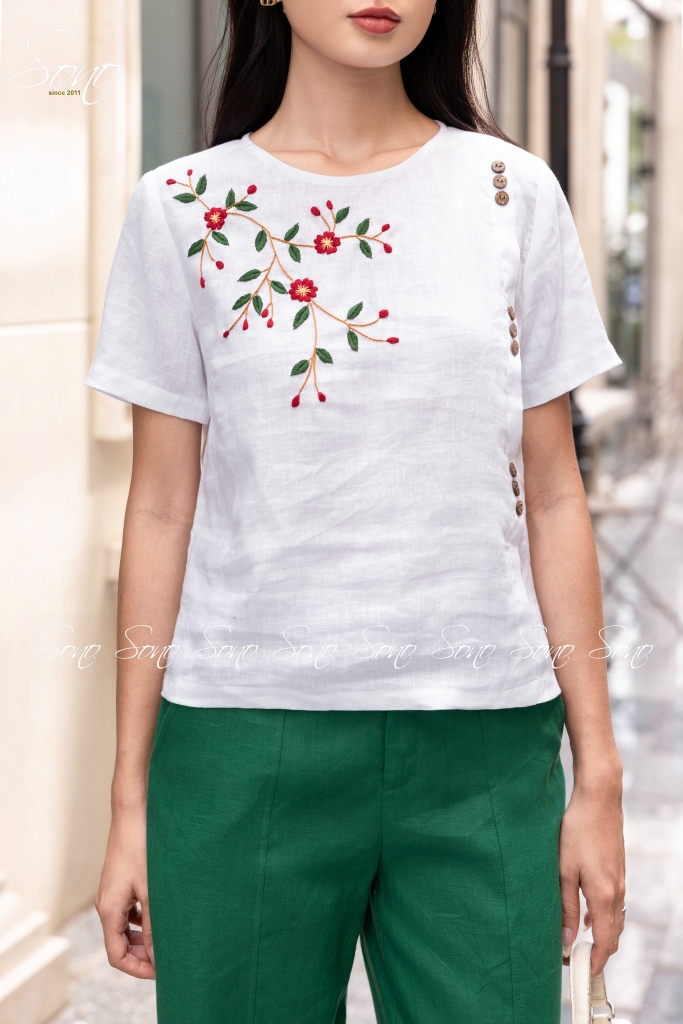 Áo linen trắng thêu hoa đỏ mang đến cảm giác vừa nhẹ nhàng vừa nổi bật.