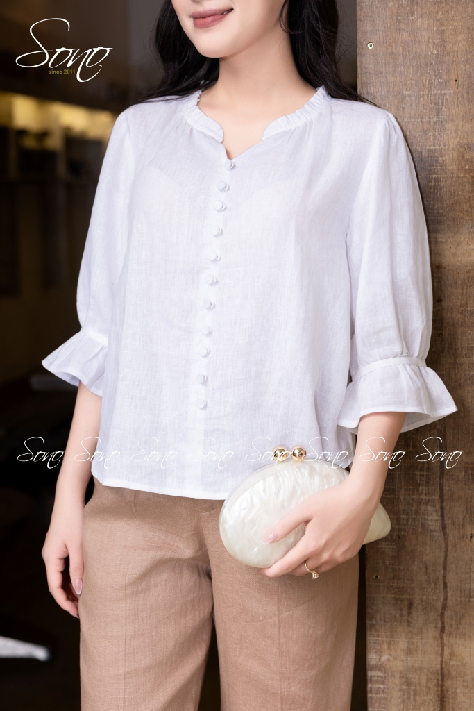 Với thiết kế cổ bèo ôm nhẹ gương mặt mang lại nét nữ tính thanh thoát, hàng cúc nhỏ tinh tế tạo điểm nhấn sang trọng mà không phô trương, và tay áo lỡ loe kín đáo nhưng duyên dáng giúp che khuyết điểm một cách khéo léo. Kết hợp với dáng quần suông giúp tôn lên vóc dáng thanh mảnh ❣️