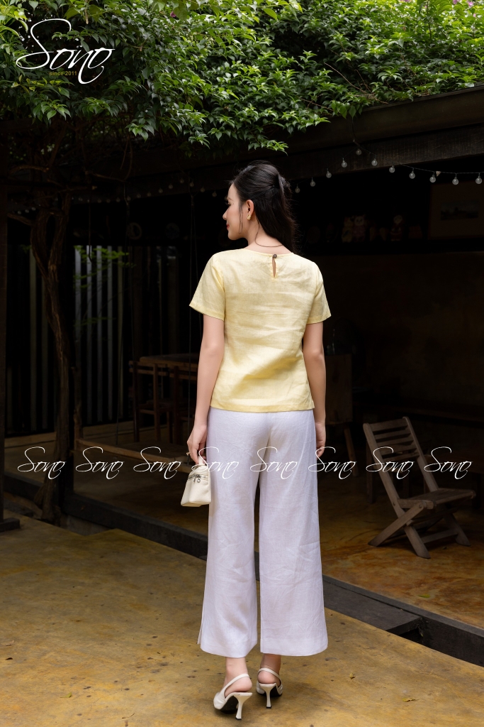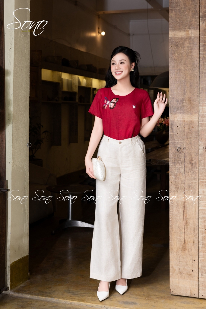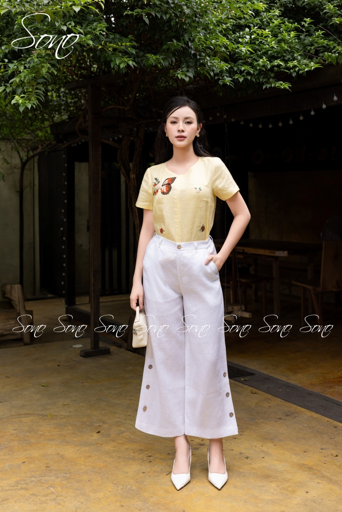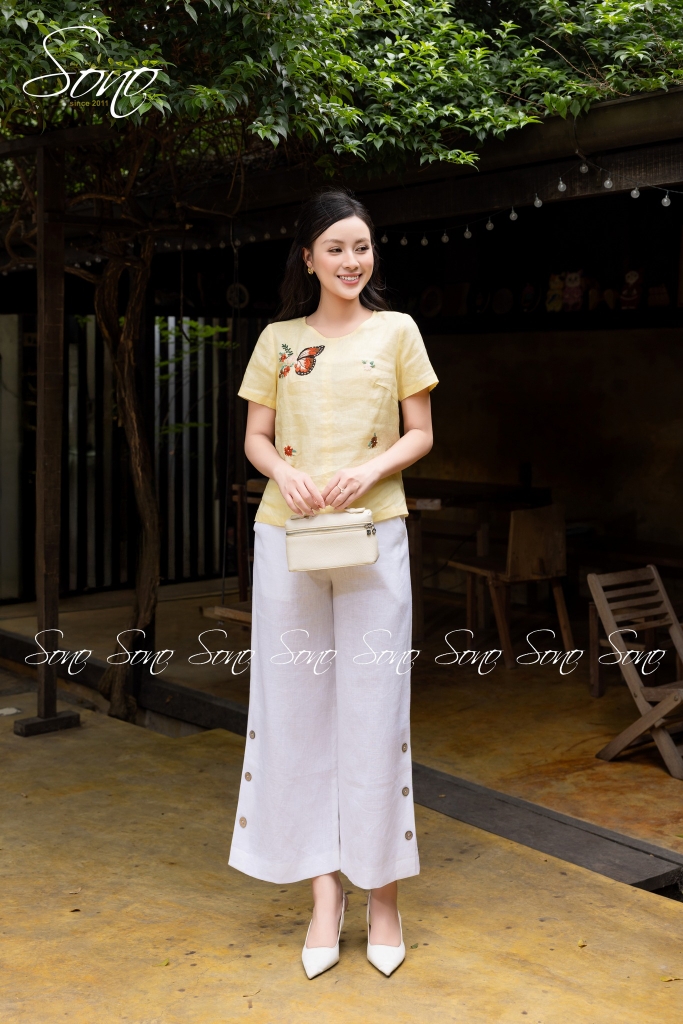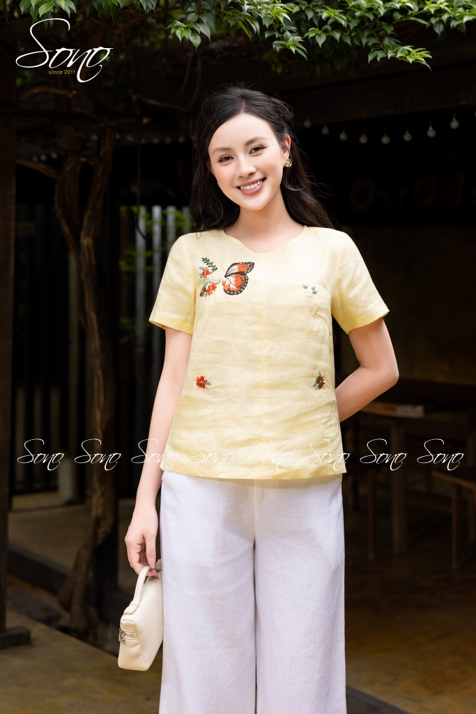 Chiếc áo linen thêu tay họa tiết bươm bướm là điểm chạm giữa sự mềm mại và tinh tế.