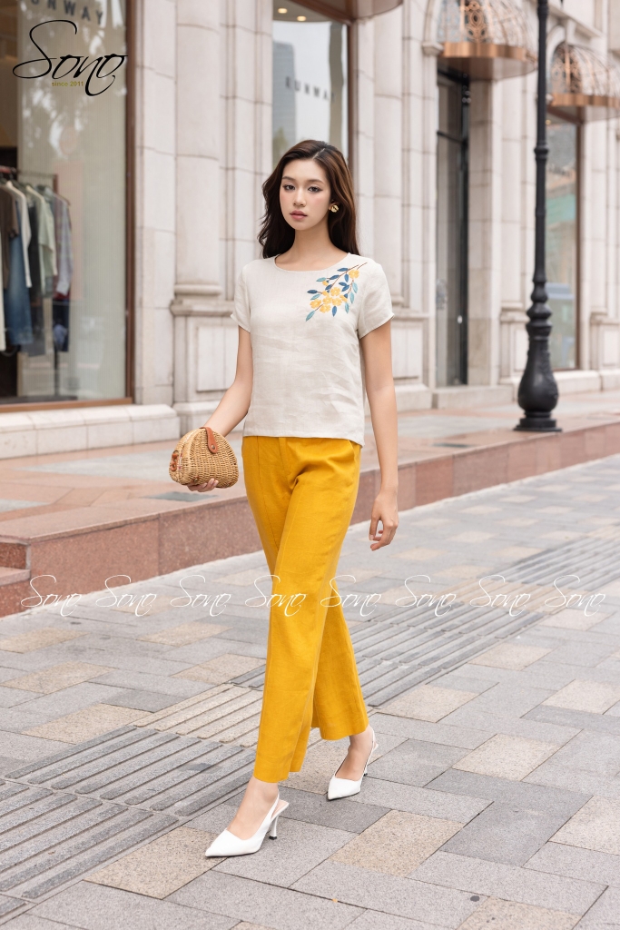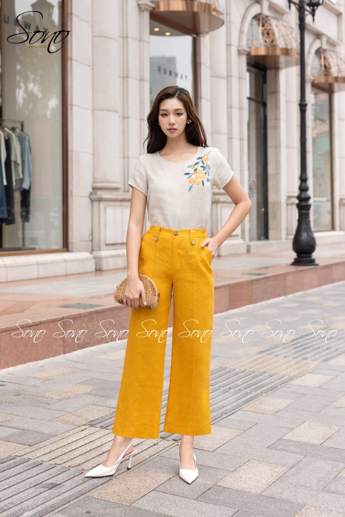 💛Kết hợp cùng quần linen vàng – gam màu tươi nhưng rất sang, giúp tổng thể set trở nên nổi bật một cách hài hòa.