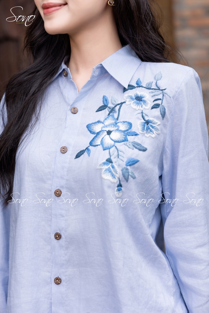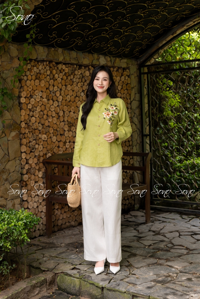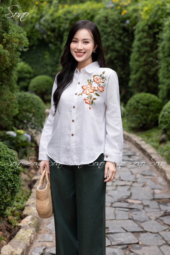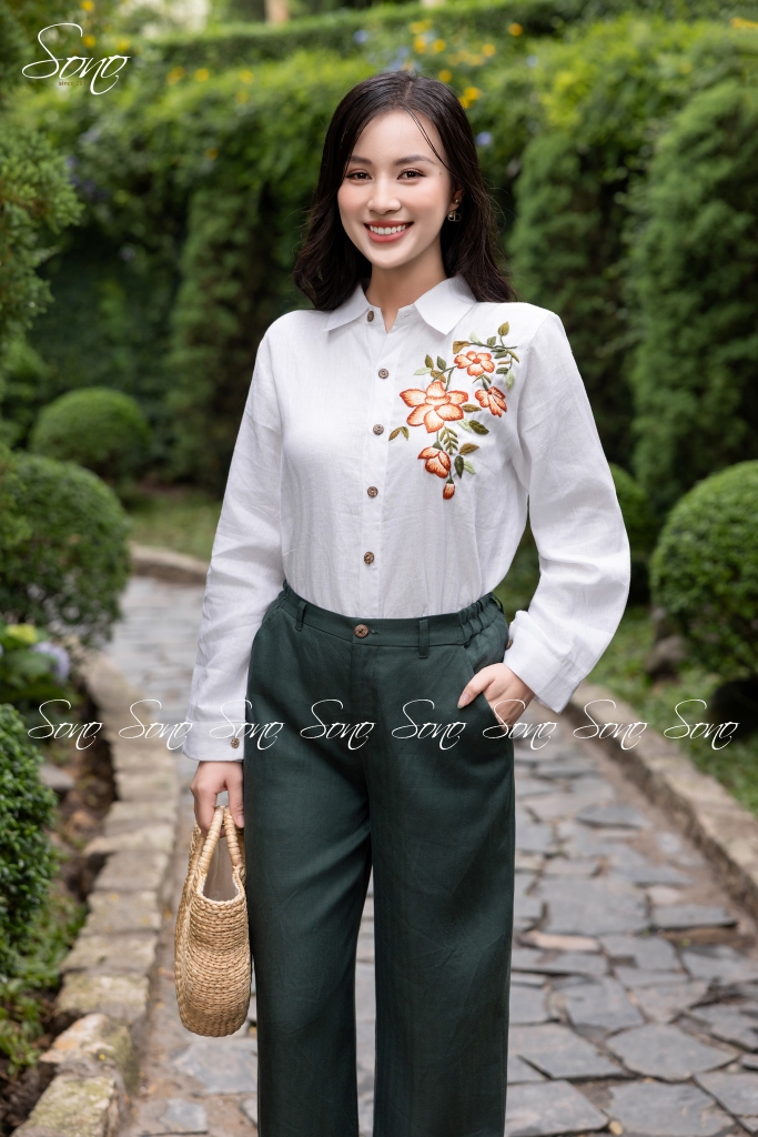 Áo sơ mi linen cùng điểm nhấn họa tiết cành hoa được thêu tay tỉ mỉ và nổi bật, phối cùng quần suông linen mang đến 1 outfit đầy nữ tính, duyên dáng và khác biệt