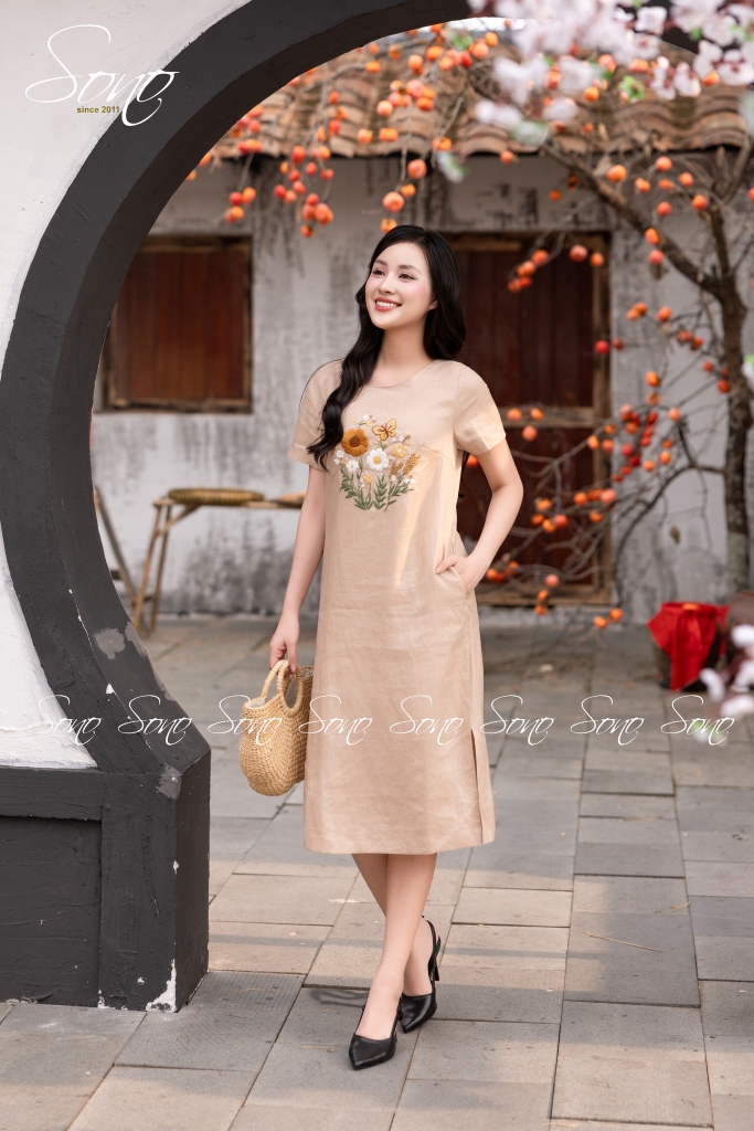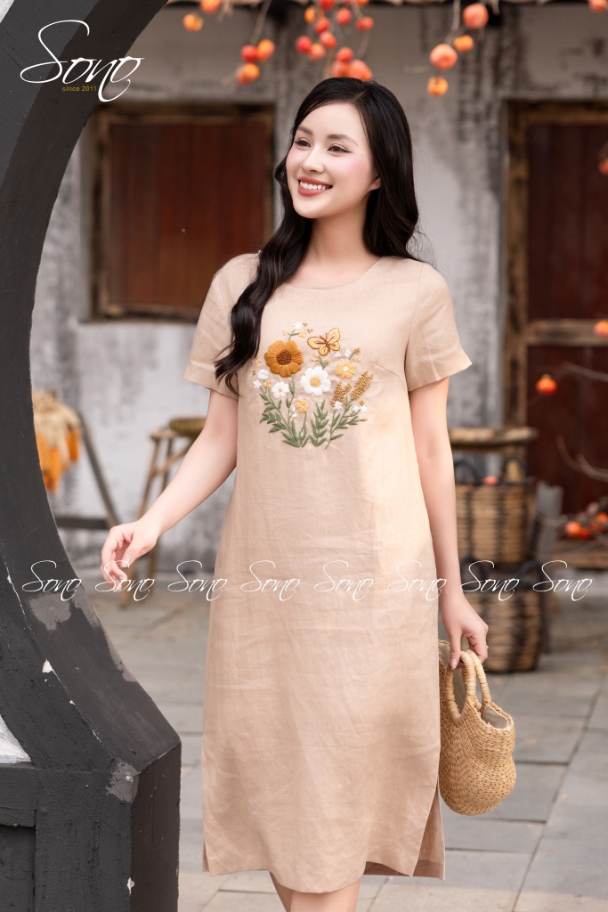 SONO - Đầm linen có tay thêu hoa bướm