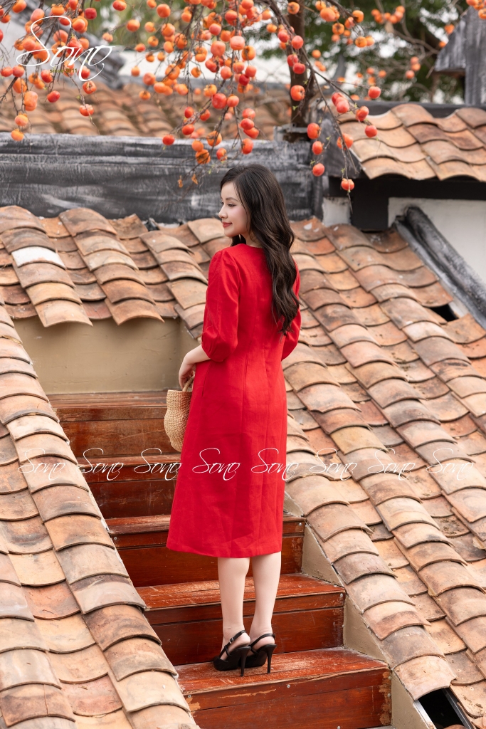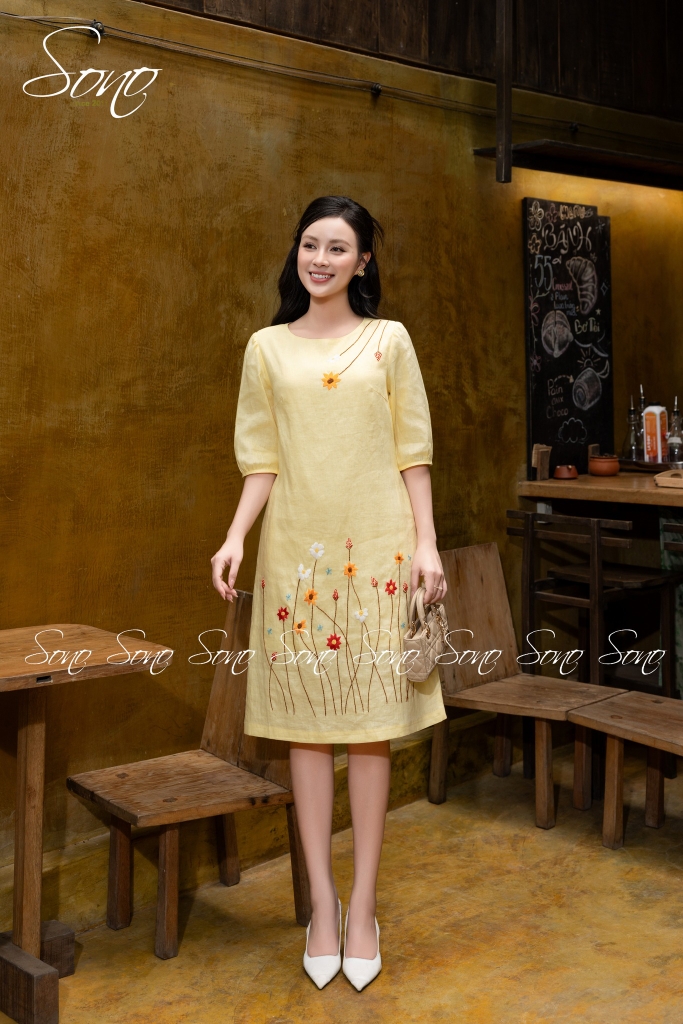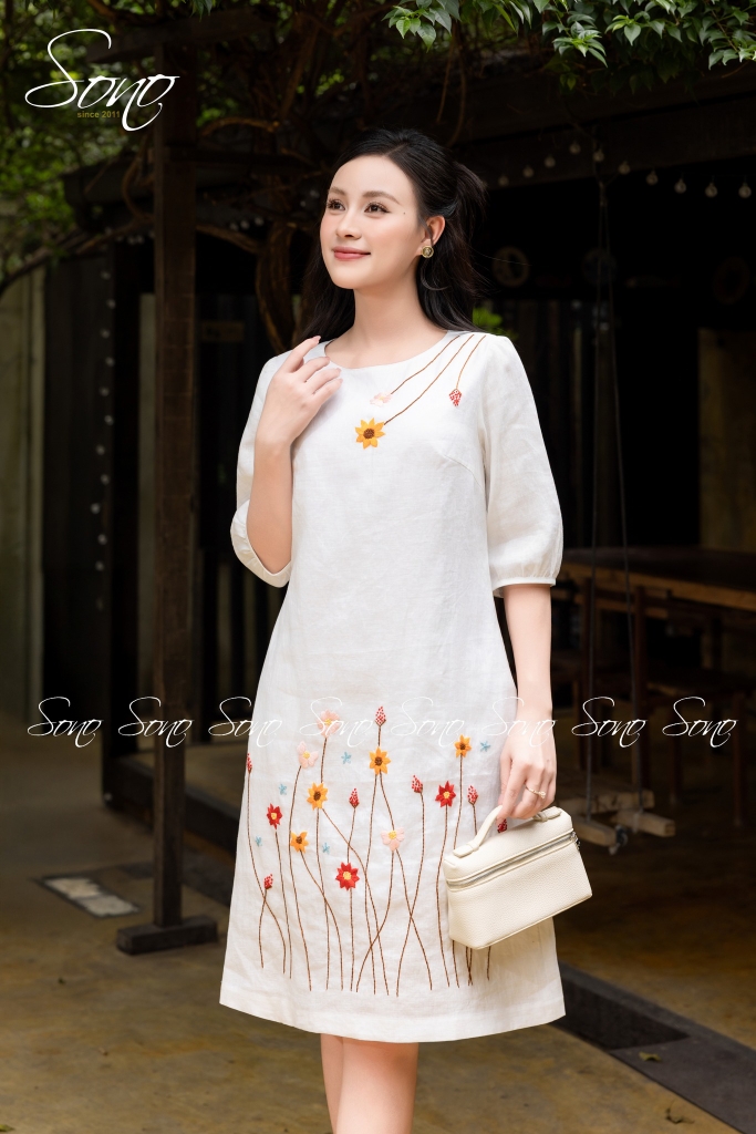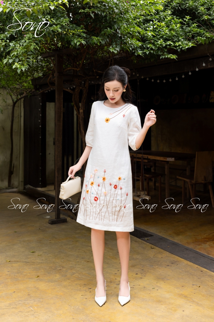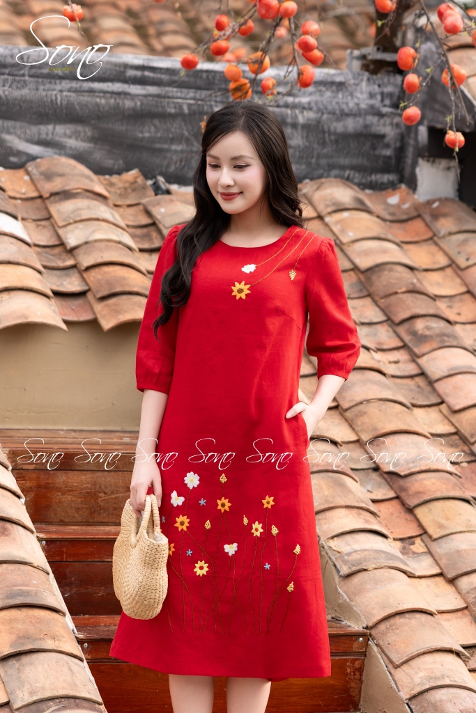 Chiếc đầm linen suông được thêu tay tỉ mỉ từng bông hoa thêu tay khẽ nở như gửi gắm lời chúc một năm mới an vui – nhẹ nhàng mà trọn vẹn.